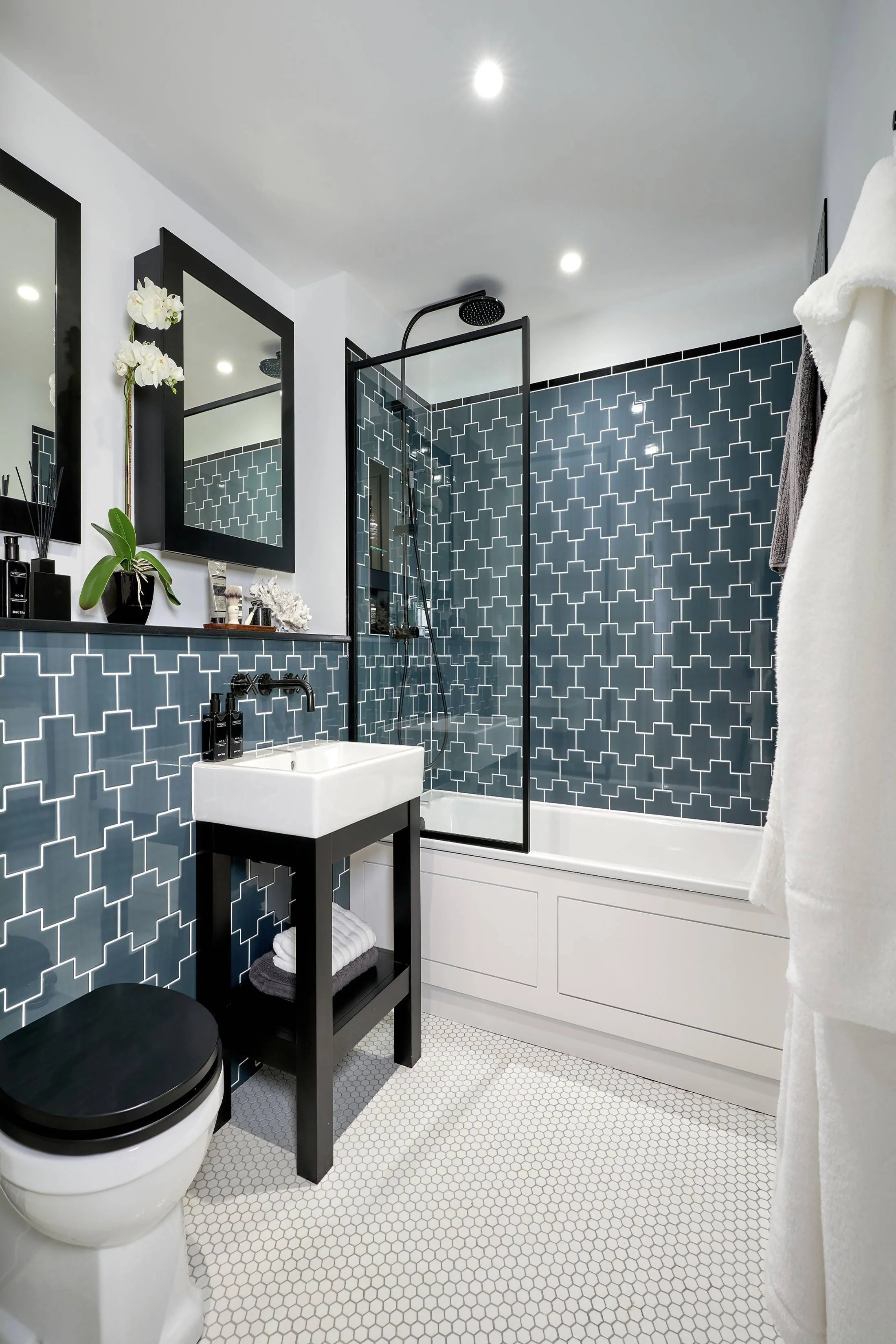 Materials: Silestone Iconic Black, White and Blue Swiss Cross tiles, White & Black 25mm Hexagon mosaic & White ceramic metro tiles.